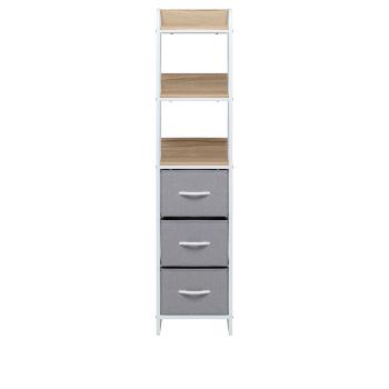 Полки комода позволяют размещать книги, декоративные элементы или мелкие предметы. Верхние уровни выполнены из МДФ с водоотталкивающей обработкой, что делает комод пригодным для использования даже во влажных помещениях. Стальной каркас и пластиковые ножки обеспечивают устойчивость и защиту пола от повреждений.