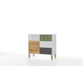 Овалы”“. Корпус и внутреннее наполнение – Белые, Фасады: Дуб Вотан, Олива с УФ-печатью ““Овалы”“, Белый, Темно-серый. ЛДСП 16 мм,