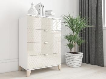 Комод Сканди 21 ваниль глянец не занимает много места, но в то же время очень вместительный. Благодаря этому он является функциональным местом хранения. Большое количество ящиков и их внутреннее пространство можно использовать на 100%, а на верхнюю поверхность комода можно поставить телевизор, часы, статуэтки или дополнить его зеркалом.