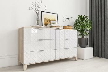 Компромисс эстетики и практичности. Комод выполнен в популярном скандинавском стиле. Корпус в светлых древесных тонах, фасады с ромбовидными узорами. Высокие буковые ножки придают изделию визуальную легкость.