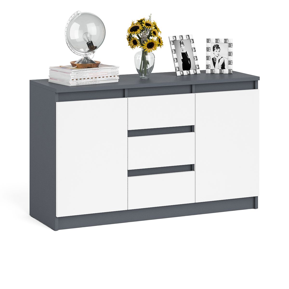 Комод-тумба три ящика и две дверки Мори МК1200.3. Габариты (ШхГхВ) 120,4х41х73 см. Комод-тумба оборудована по центру тремя выдвижными ящиками и двумя закрытыми отделениями с полками по бокам. Отсутствие ручек главное преимущество данной модели. Роль ручек выполняют сами фасады. Открывание ящиков и дверей производится за счет пространства между планками и фасадами.
