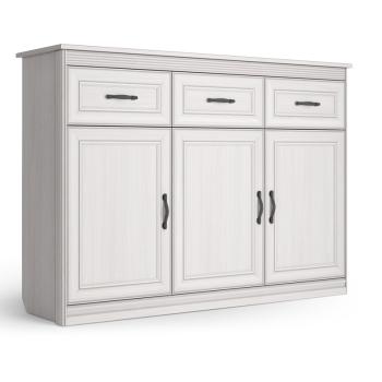 Нарядный образ большого комода в классическом стиле подчеркивают фигурные накладки и профили, а также металлические ручки цвета античная бронза.