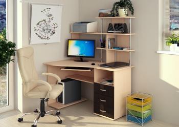 Компьютерный стол «Форест» оборудован тремя выдвижными ящиками на роликовых направляющих, обилием полок под оргтехнику и системный блок.