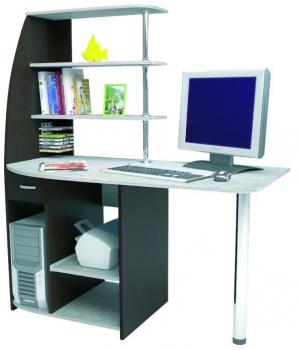 Компьютерный стол «Скай» оборудован выдвижным ящиком на роликовых направляющих, полками под оргтехнику и системный блок, а также выкатной полкой под принтер.