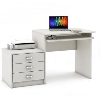оборудован широкой, двухуровневой столешницей, тремя глубокими выдвижными ящиками и полкой под клавиатуру ПК. Мебель представлена