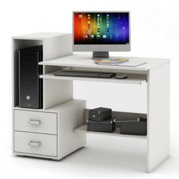 Стол отличается широкой столешницей, с левой стороны которой расположены два выдвижных ящика и место под системный блок.