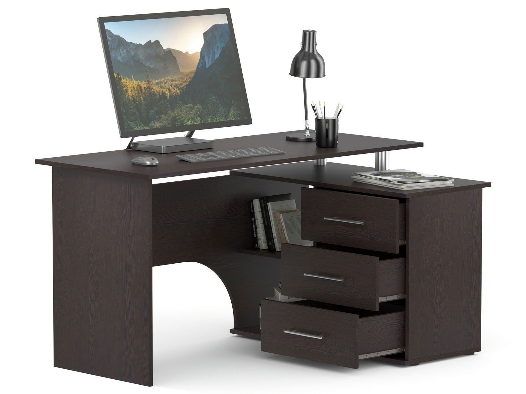 Угловой компьютерный стол КСТ-09 — идеальное решение для организации рабочего процесса как в домашнем кабинете, так и в офисной обстановке. Продуманная конструкция подразумевает две поверхности для размещения техники и подручных предметов, несколько открытых ниш и три выдвижных ящика для организации системы хранения книг, бумаг и канцелярских принадлежностей.