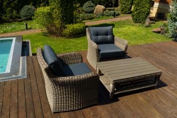Материал кресла: искусственный ротанг/алюминий, подушки: 100% polyester с наполнителем