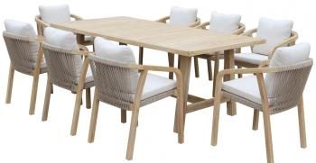 Обеденная группа Ravona, рассчитанная на 8 персон, – это садовая мебель из АКАЦИИ в современном стиле. Дизайнерские формы мебели из этой коллекции создадут стильный и узнаваемый облик зоны отдыха на вашей веранде. Ravona – это современная коллекция садовой мебели из акации, выполненная в комбинации натурального веревочного плетения роуп, массива акации и бежевых подушек. Цвет натуральной твердой древесины представляет собой натуральный цвет с мелкой текстурой, придающий древесине приятный теплый вид. Ravona – это стиль и элегантность на Вашей веранде.
