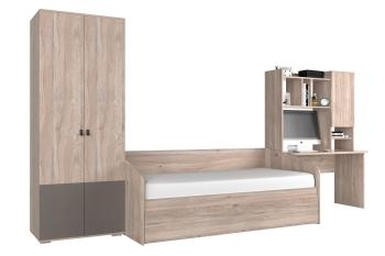 Комплект "Модерн К11" сочетает в себе эргономичность и стильный дизайн. Шкаф с двумя дверцами обеспечивает достаточно места для хранения одежды и личных вещей, а кровать-софа шириной 90 см создает комфортное спальное место. Письменный стол с надстройкой позволяет организовать удобное рабочее пространство для занятий.