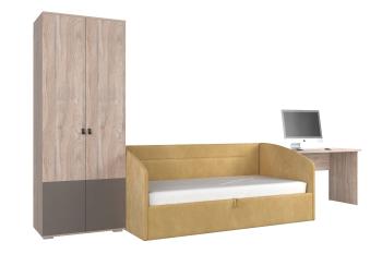 Комплект выполнен в современном стиле с продуманной эргономикой. Каждый элемент гарнитура создан с учетом потребностей ребенка: шкаф с удобными дверцами, кровать с ортопедическим основанием, стол оптимальной высоты для занятий.