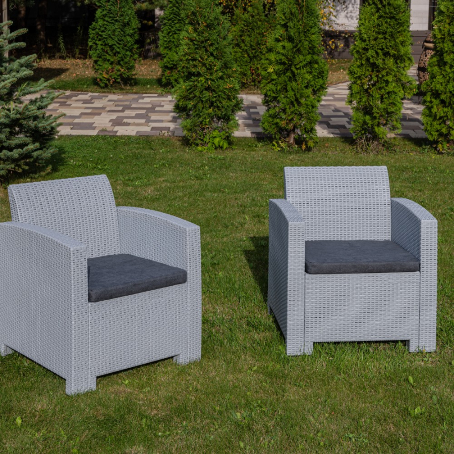Каждое кресло имеет размеры 68х66х76 см и выполнено из окрашенного в массе полипропилена, обеспечивающего высокую прочность и долговечность. Кресла окрашены в элегантный графит, что придаёт им современный вид. Подушки также выполнены в этом цвете и оформлены из полиэстера, а наполнитель — из поролона, что гарантирует удобство при сидении.