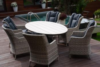 Комплектация: 1шт — стол, 6шт — кресел с подлокотниками и подушками