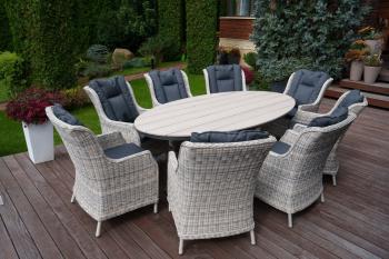 Комплектация: 1шт — стол, 8шт — кресел с подлокотниками и подушками