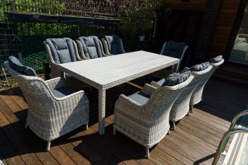 Комплектация: 1шт — стол, 8шт — кресел с подлокотниками и подушками.