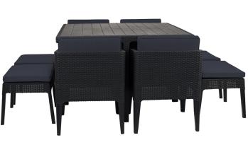 Элегантный и современный по своей форме комплект садовой мебели, состоящий из девяти элементов: большого стола, 4 удобных кресел и 4 подставок для ног, также выполняющих функцию пуфов. Его модульная конструкция позволит сэкономить место – после пользования можно убрать сиденья и пуфы под стол. Комплект спроектирован с заботой о тех, кто любит беседовать на свежем воздухе. Он идеально подойдет для организации семейного барбекю или вечеринки в саду. Вдохновленная натуральным ротанговым плетением фактура поверхности и удобные подушки – это дополнительные достоинства этого продукта. Комплект прост в чистке, легко монтируется и устойчив к действию неблагоприятных атмосферных условий и ультрафиолетовых лучей.