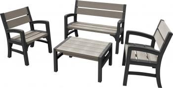 Удобные сиденья и спинки, профилированные подлокотники, и, кроме того, современный, минималистский дизайн. Комплект WLF – это комбинация комфорта, современного стиля и высококачественного материала. Он состоит из двух удобных кресел, двухместной практичной скамьи и столика оптимального размера. Исключительным преимуществом этого мебельного комплекта является оригинальное оформление поверхности, имитирующее настоящий рисунок дерева. Мебель устойчива к воздействию неблагоприятных атмосферных условий. Легко поддерживать чистоту комплекта, простой монтаж.