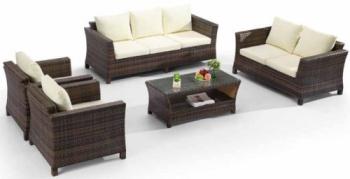 Сочетание коричневого плетения ротанга и бежевых подушек придает этой мебели экзотический и уютный внешний вид.