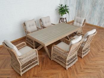 Комплект мебели из искусственного ротанга ИЗАБЕЛЛА на 6 персон, натуральный цвет, столешница из искусственного дерева, алюминиевый каркас, подушки входят в набор.