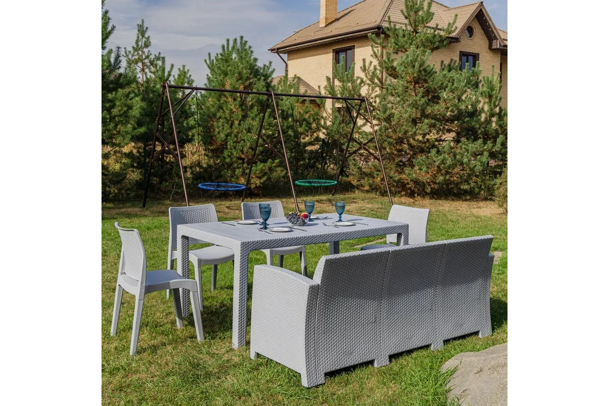 Изготовлен комплект из прочного полипропилена, окрашенного в массе, что обеспечивает долговечность. Цвет мебели — элегантный серый, который прекрасно вписывается в любой ландшафт. Чехлы подушек выполнены из полиэстера, а наполнитель — из поролона, что делает отдых еще более комфортным.