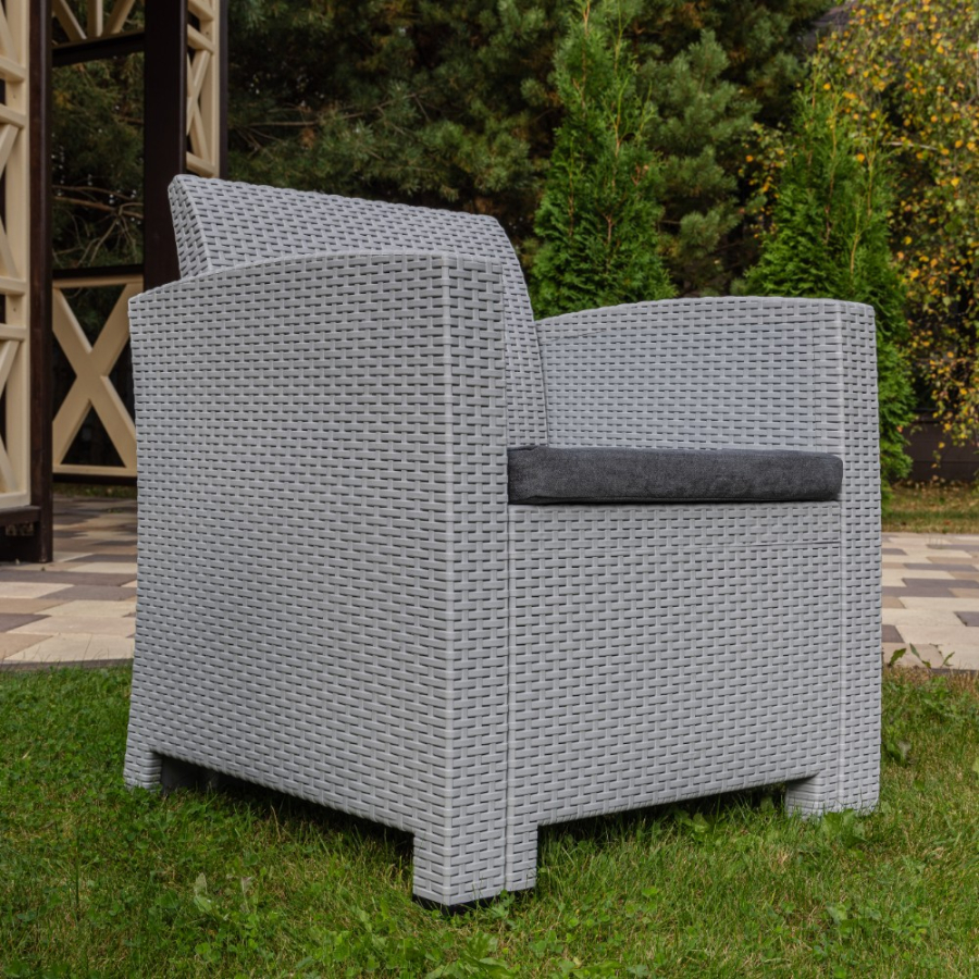 Изготовленный из высококачественного полипропилена, окрашенного в массе, комплект отличается долговечностью и прочностью. Современный графитовый цвет отлично вписывается в любой интерьер. Чехлы подушек выполнены из полиэстера, а наполнители из поролона обеспечивают комфорт во время питания и общения.