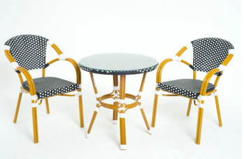 Кресла имеют неразборную конструкцию. Сиденья выполнены сплошным ажурным плетением из текстилена. Текстилен – это сетка индустриального плетения из полиэстеровой нити с виниловым покрытием. Этот современный материал наилучшим образом подходит для изготовления садовой мебели, так как не впитывает влагу.