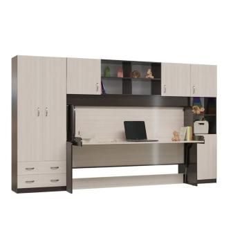 Лидером комплекта является кровать-трансформер, которая днем может служить столом для занятий, а ночью- превращается в полноценное спальное место для вашего подростка. Кровать имеет спальное место 90х190 см. Для кровати надо купить не очень высокий матрас, желательно не выше 20 см. Причем, матрас может быть любой, так как он кладется на ровную поверхность основания ДСП и нет необходимости, чтобы он держал форму с помощью внутреннего каркаса.