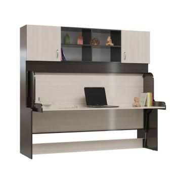 Лидером комплекта является кровать-трансформер, которая днем может служить столом для занятий, а ночью- превращается в полноценное спальное место для вашего подростка. Кровать имеет спальное место 90х190 см. Для кровати надо купить не очень высокий матрас, желательно не выше 20 см. Причем, матрас может быть любой, так как он кладется на ровную поверхность основания ДСП и нет необходимости, чтобы он держал форму с помощью внутреннего каркаса.