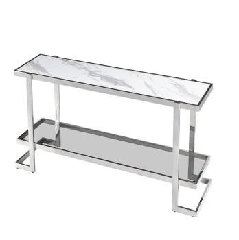 Консоль, столешница глазурирование стекло под МРАМОР 8 мм, полка закаленное тонированное стекло. Хромированный каркас.