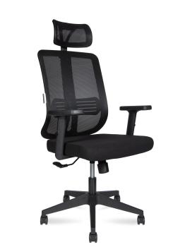 Офисное кресло с высокой спинкой, регулируемый по высоте подголовником, спинка сетка, сиденье фармованое ПУ, пластиковый подлокотник 2 D, механизм Топ Ган с фиксацией в одном положении, Нейлоновая база, ролики ПУ