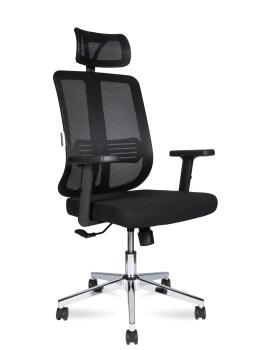 Офисное кресло с высокой спинкой, регулируемый по высоте подголовником, спинка сетка, сиденье фармованое ПУ, пластиковый подлокотник 2 D, механизм Топ Ган с фиксацией в одном положении, Хромированная база, ролики ПУ