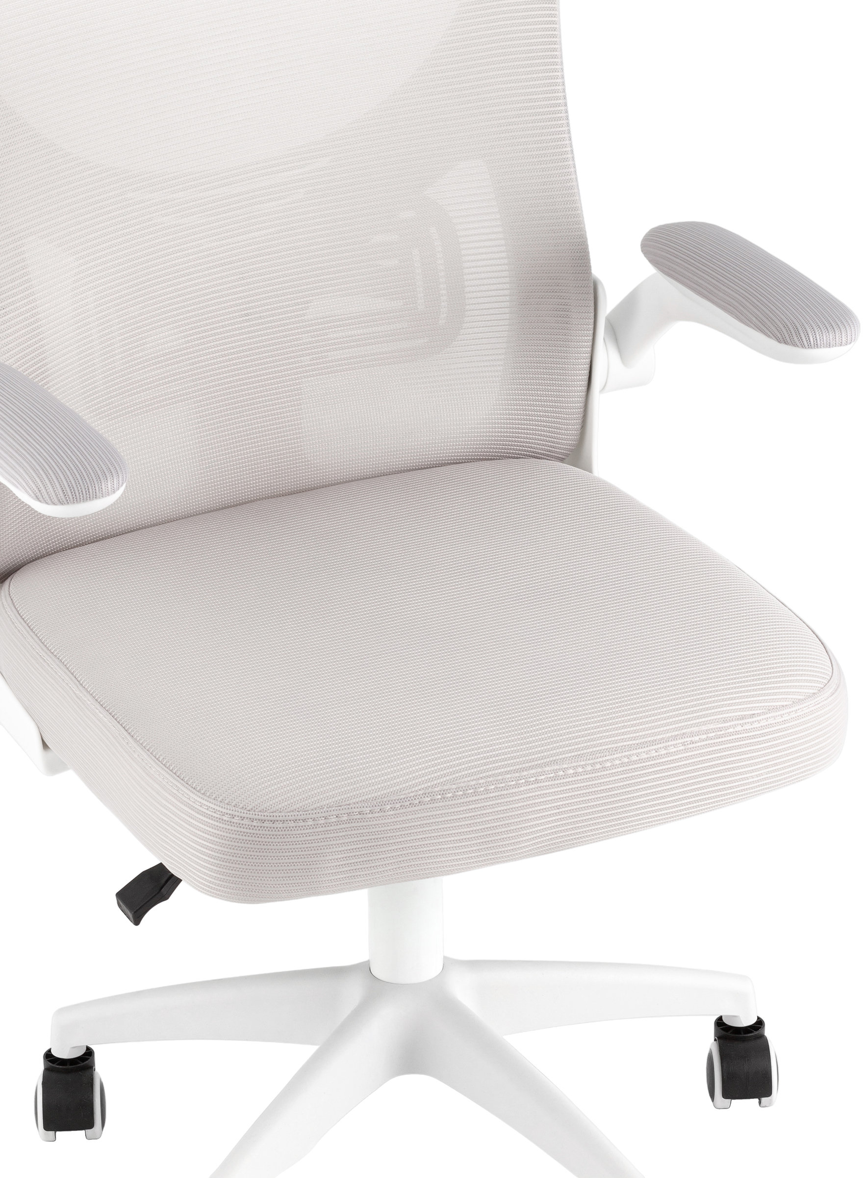 Светлый цвет обивки и базы придают креслу легкий и современный вид, который гармонично впишется как в домашний кабинет, так и в деловую офисную среду. Компактная конструкция и мобильность делают кресло удобным и функциональным решением для любых рабочих задач.