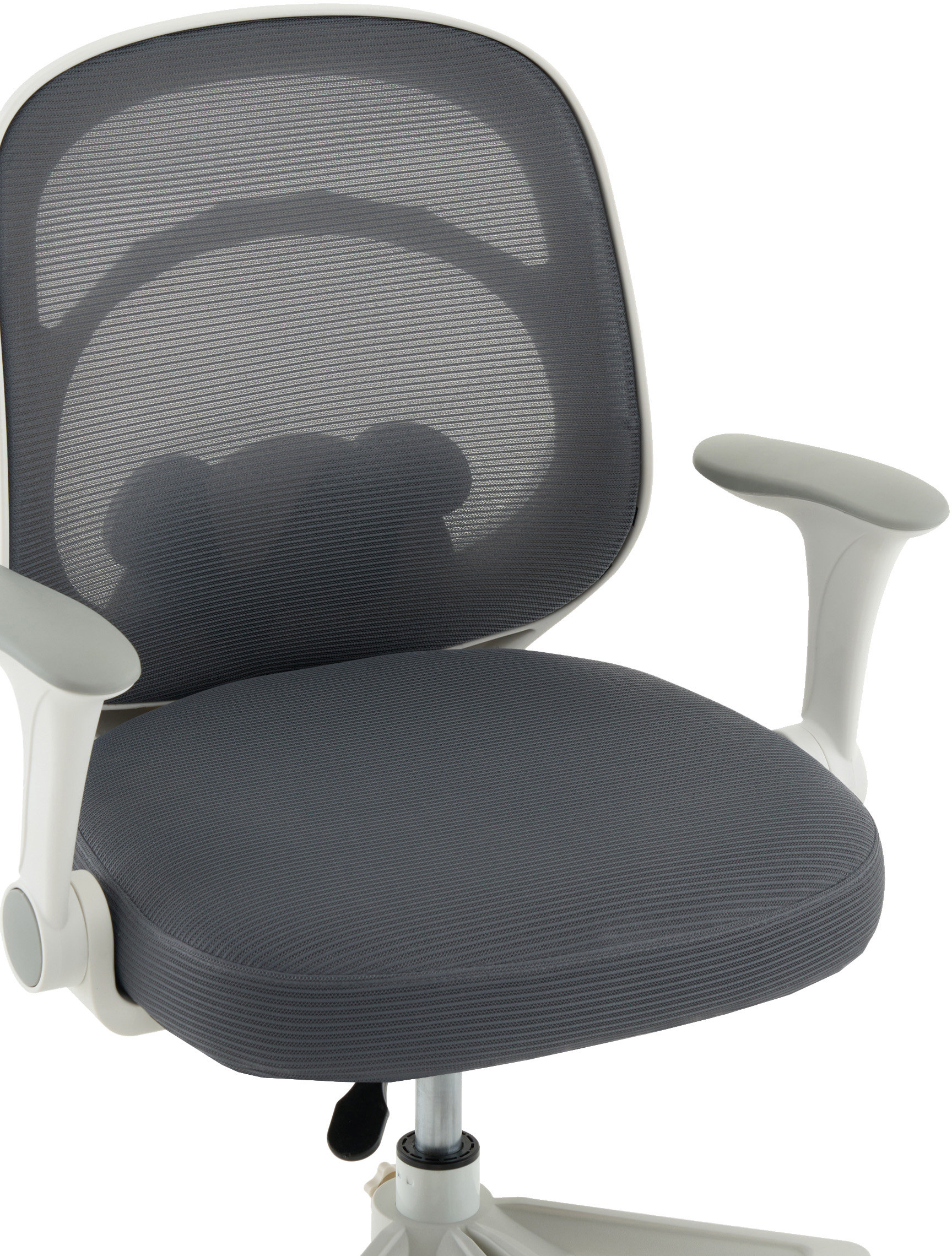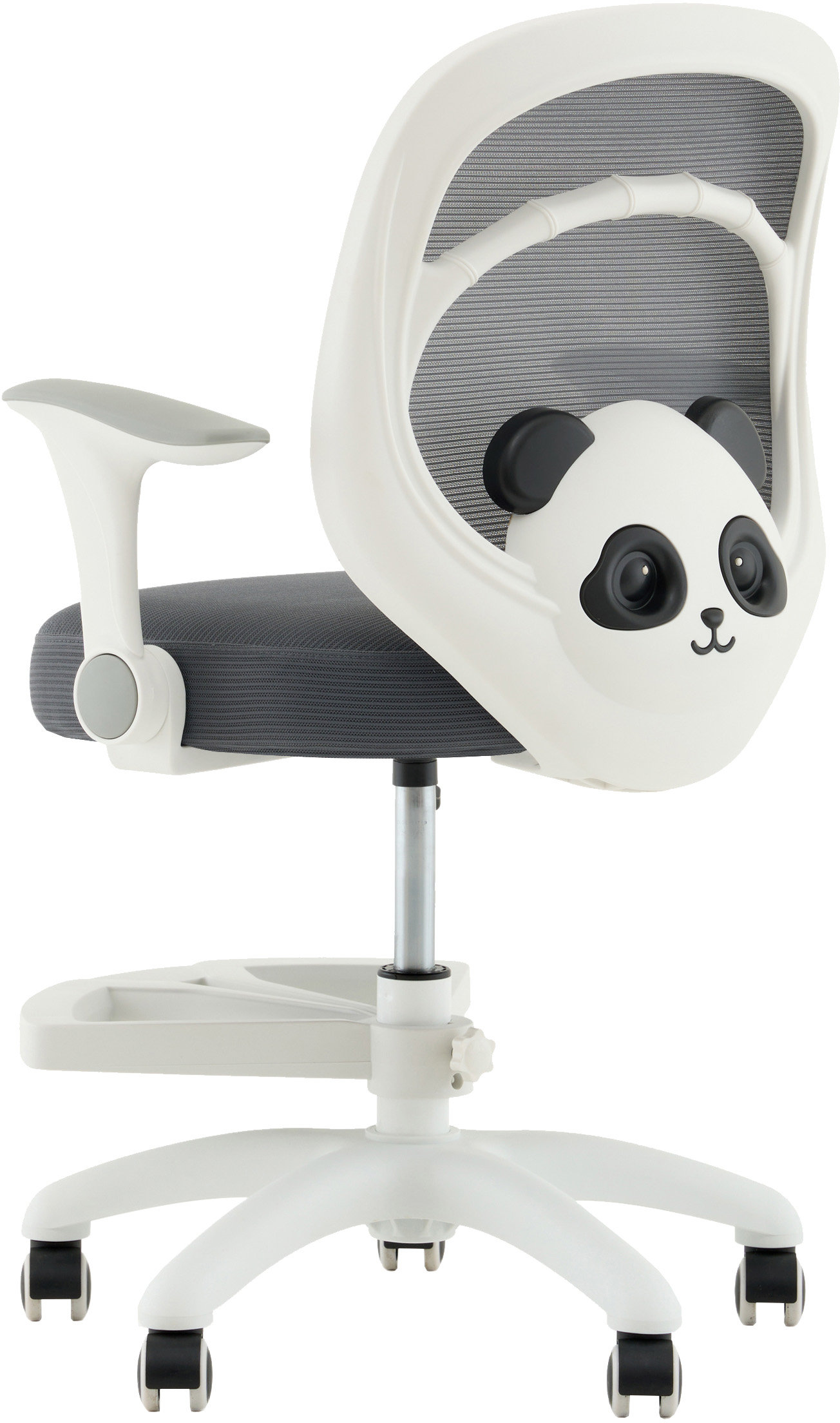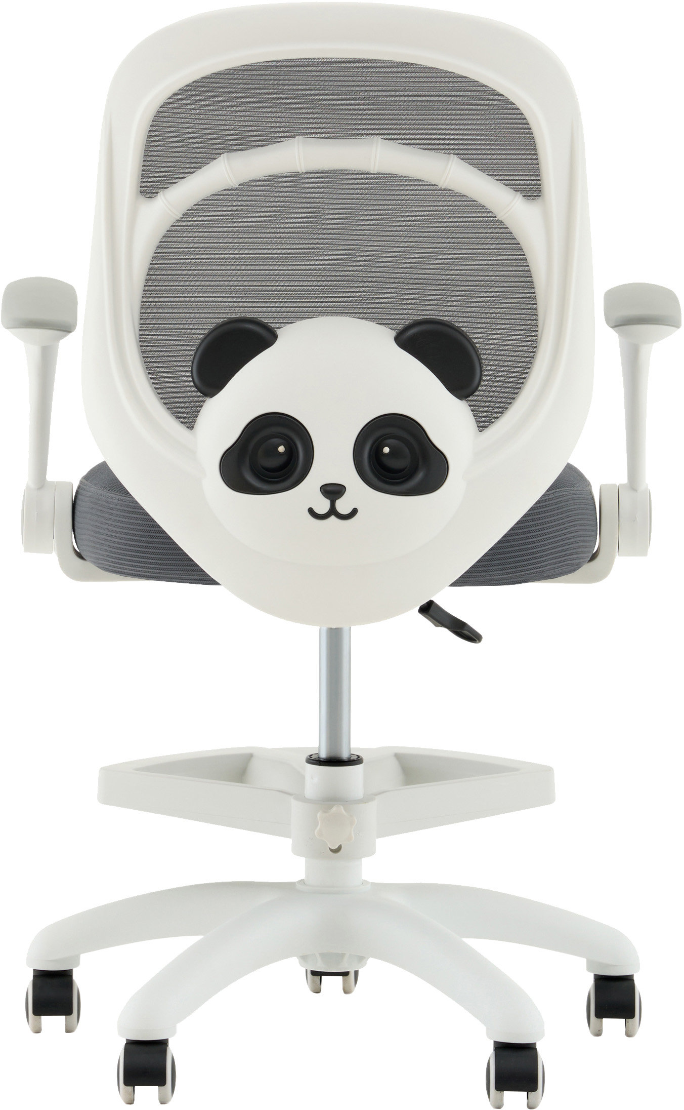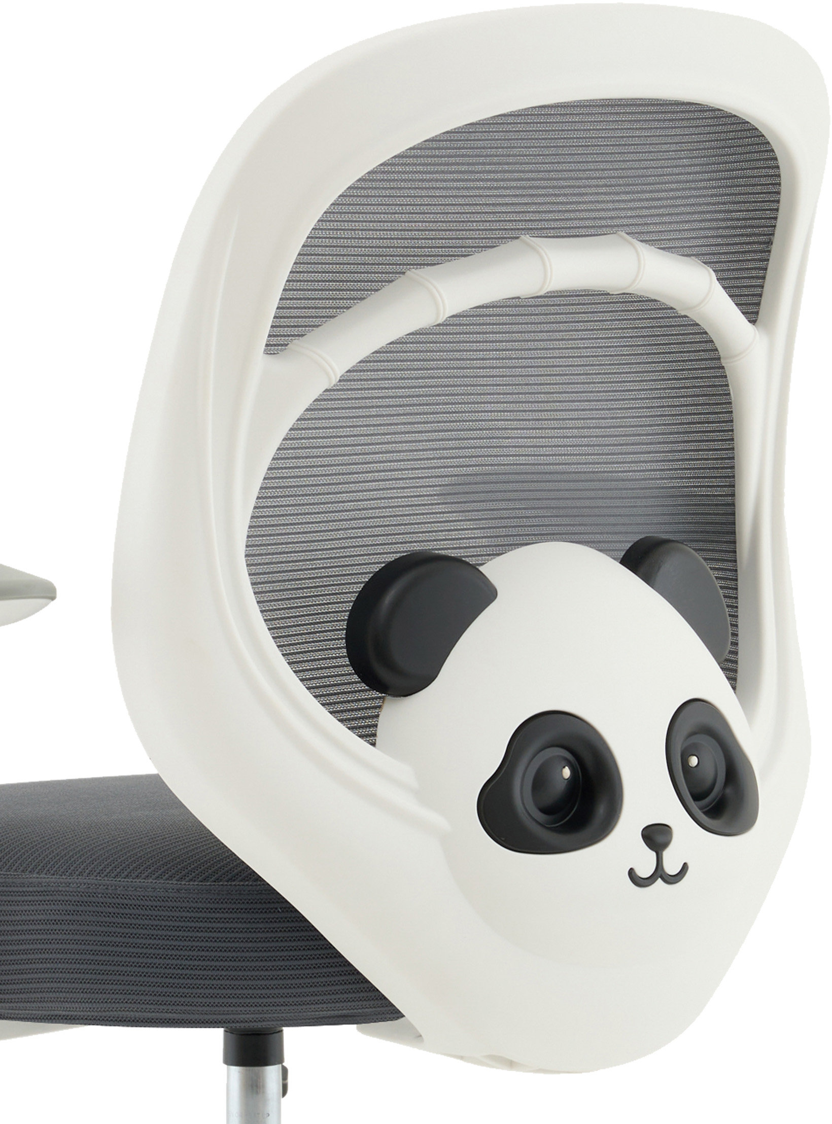 Задняя часть спинки украшена фигуркой панды — стильным акцентом, который украсит любую детскую комнату. Светлая обивка из сетки гармонирует с белым корпусом, придавая креслу свежий и аккуратный вид.
