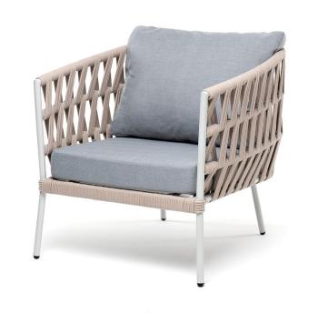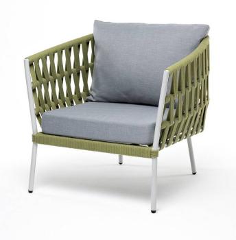 Кресло имеет алюминиевый каркас, окрашенный порошковой краской в светло-серый (RAL7035) цвет. Боковины каркаса вручную оплетены роупом – эластичными синтетическими лентами, изготовленными из высокопрочных полиэфирных волокон. Цвет оплетки – бирюзовый.