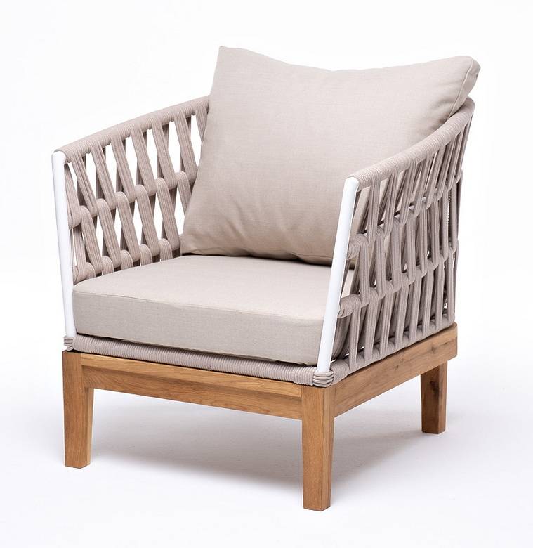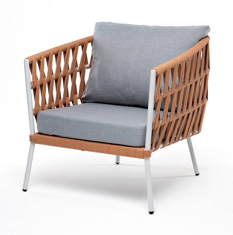 Кресло имеет алюминиевый каркас, окрашенный порошковой краской в светло-серый (RAL7035) цвет. Боковины каркаса вручную оплетены роупом – эластичными синтетическими лентами, изготовленными из высокопрочных полиэфирных волокон. Цвет оплетки – бирюзовый.