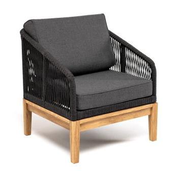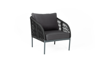 Каркас кресла оплетен синтетическими лентами, выполненных из полиэфирных волокон высокой прочности (роуп). Цвет плетения – темно-серый. Основание – натуральный дуб.