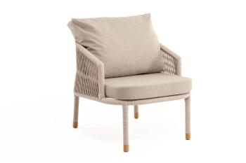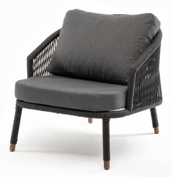Кресло имеет алюминиевый каркас, окрашенный порошковой краской в темно-серый (RAL7024) цвет. Боковины каркаса вручную оплетены роупом – эластичными синтетическими лентами, изготовленными из высокопрочных полиэфирных волокон. Цвет оплетки – темно-серый. На ножках кресла идут дубовые наконечники (заглушки).