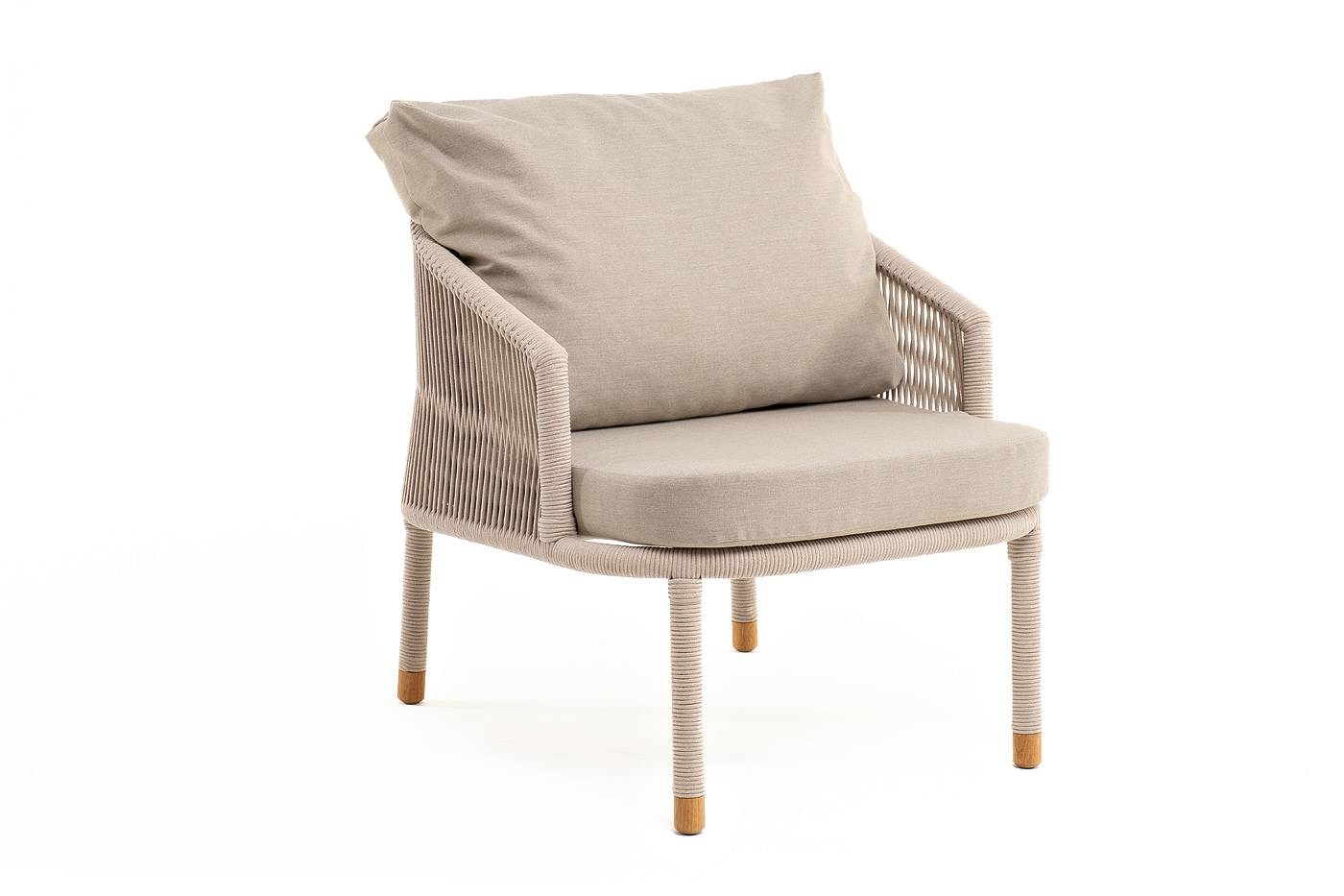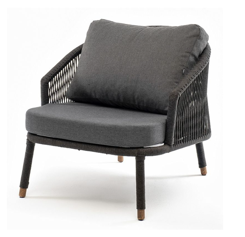 Кресло имеет алюминиевый каркас, окрашенный порошковой краской в темно-серый (RAL7024) цвет. Боковины каркаса вручную оплетены роупом – эластичными синтетическими лентами, изготовленными из высокопрочных полиэфирных волокон. Цвет оплетки – темно-серый. На ножках кресла идут дубовые наконечники (заглушки).