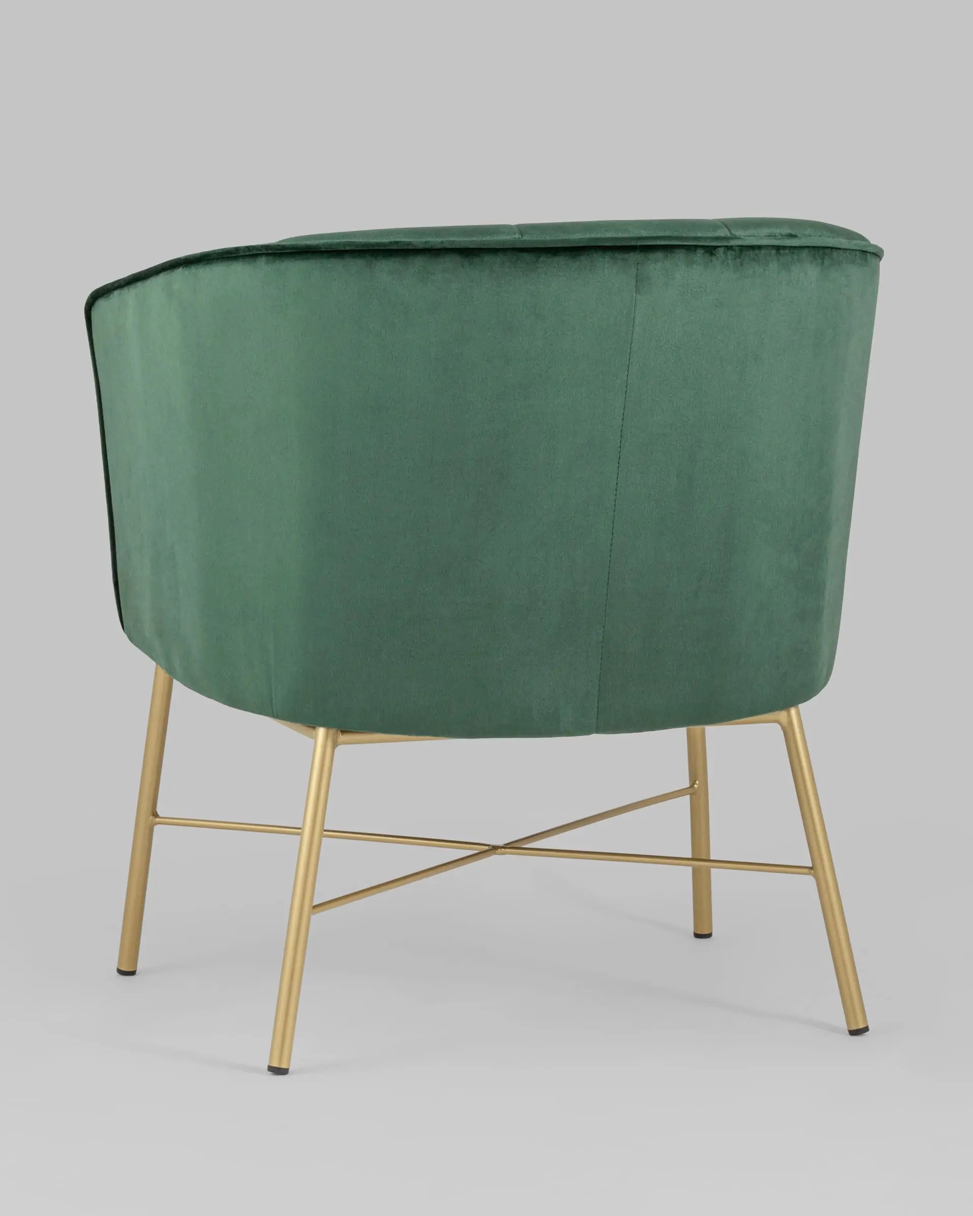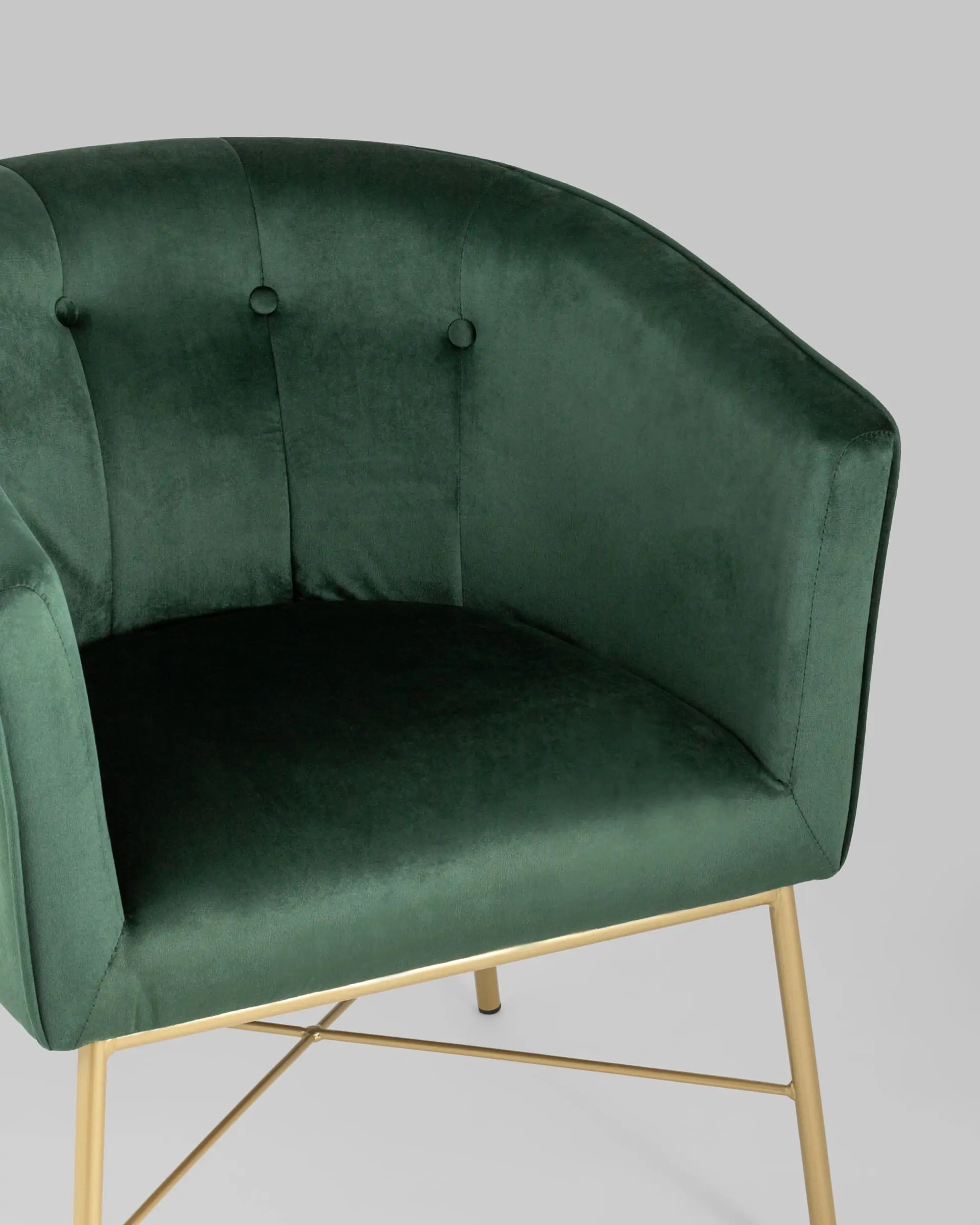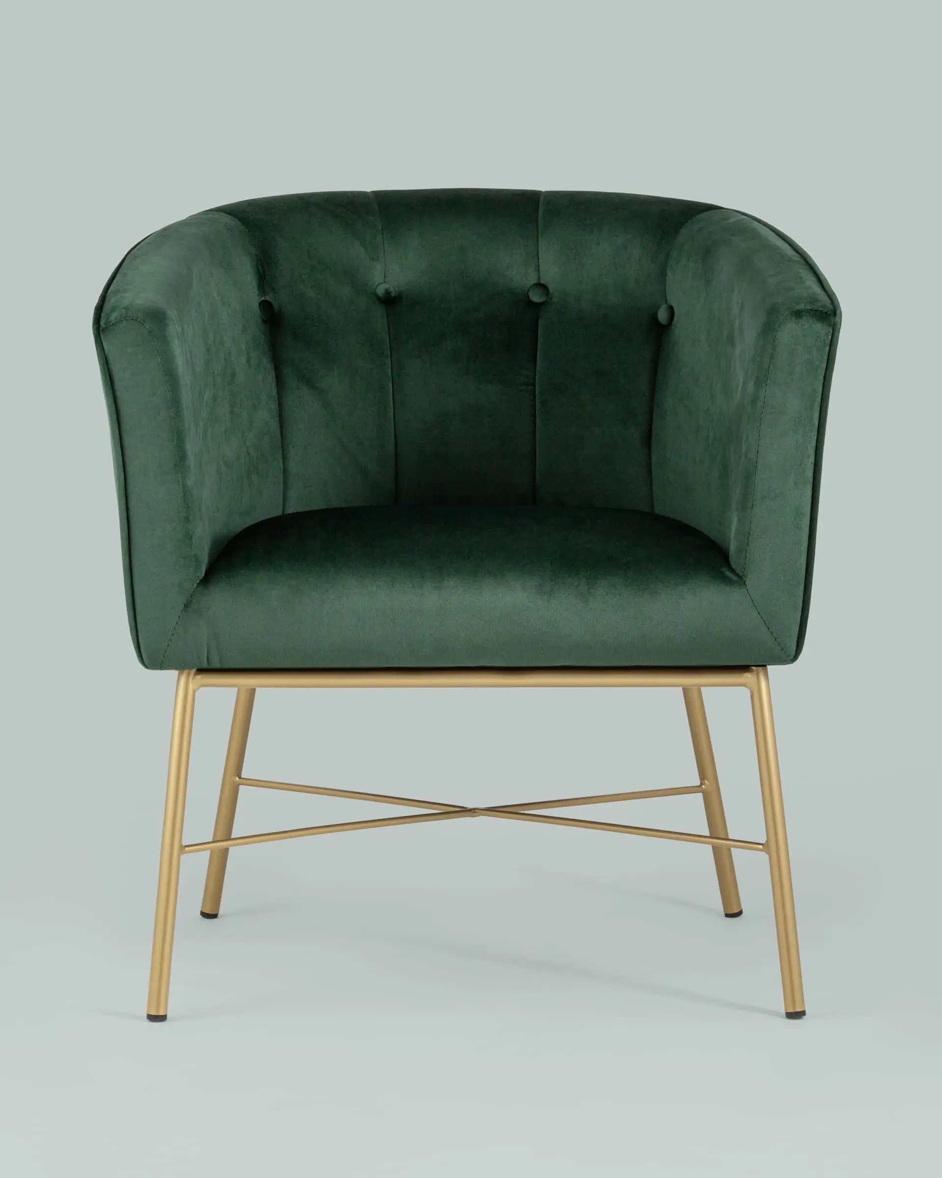 Современное кресло с подлокотниками и металлическими ножками. Обивка выполнена из прочного и износостойкого велюра. Широкая спинка, переходящая в подлокотники высотой 70 см от пола, и мягкое сиденье обеспечивает удобную посадку и уют. Украшает кресло декор на внутренней стороне спинки и металлический каркас в золотом цвете.