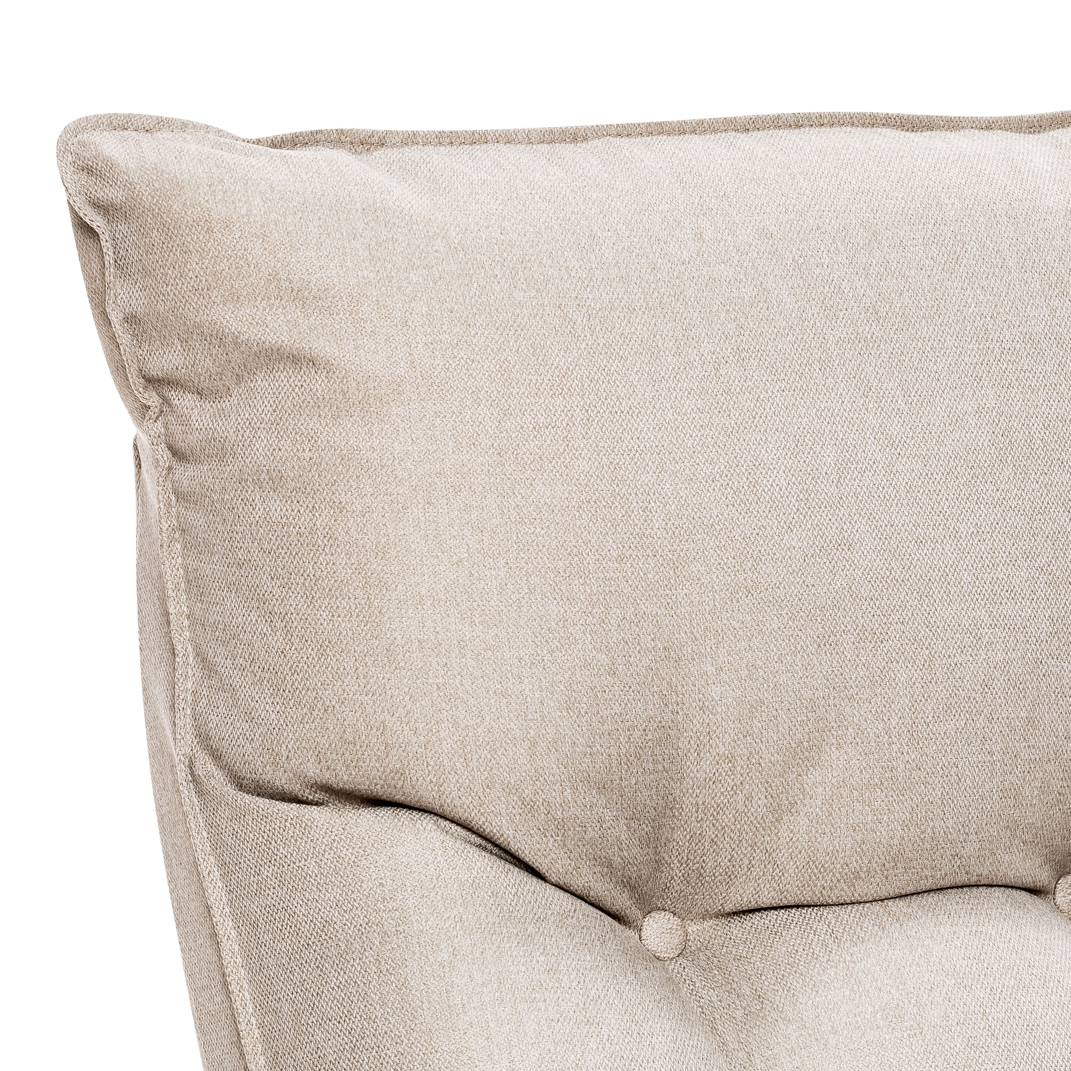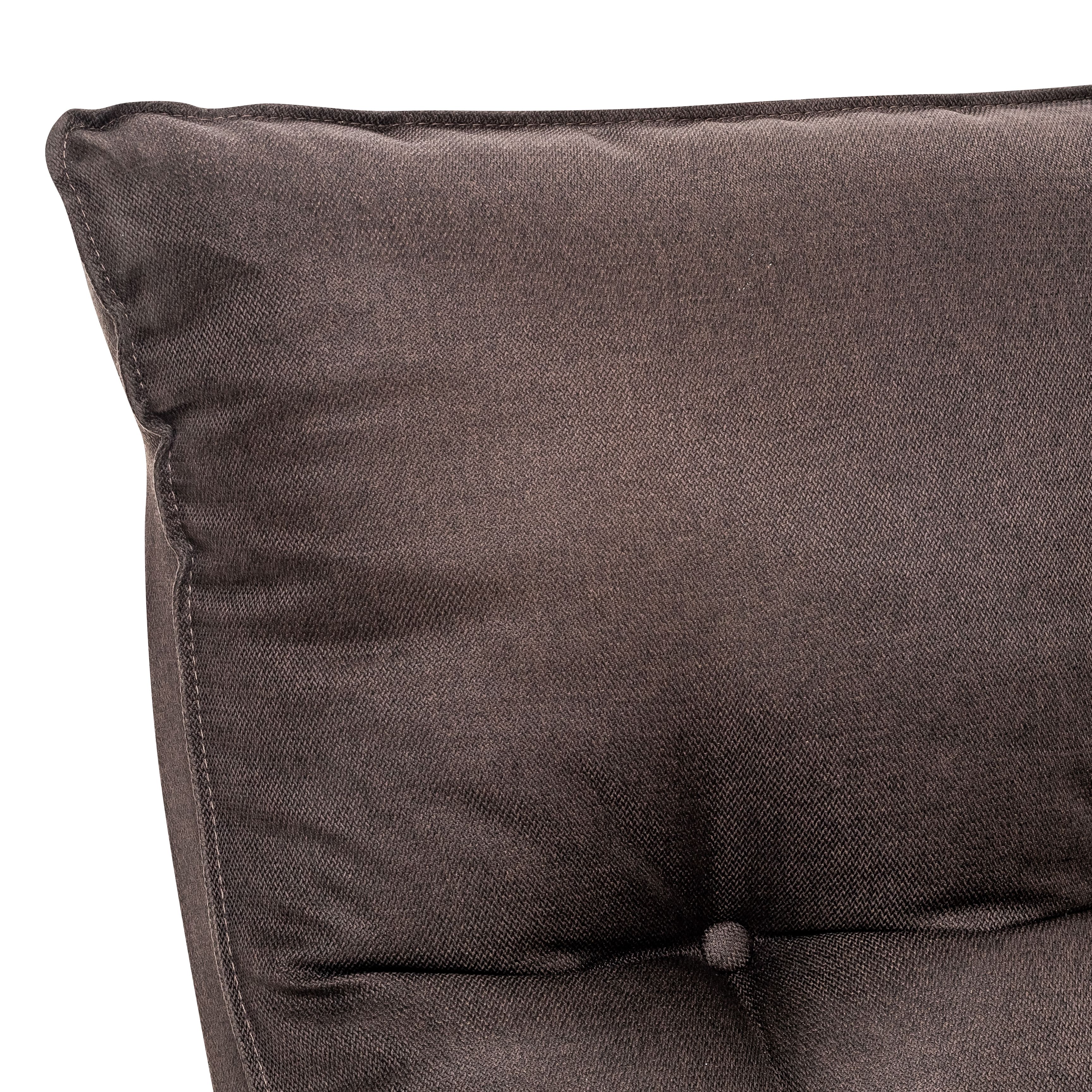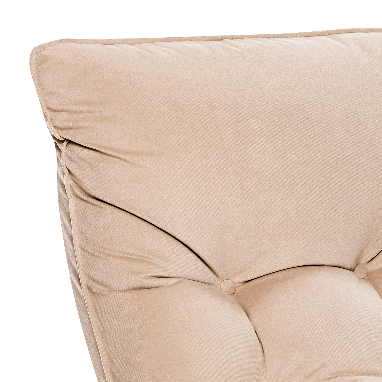 Каркас выполнен из прочного дерева с покрытием под итальянский лак, а обивка — из велюра. Наполнение из эластичного пенополиуретана обеспечивает мягкость и амортизацию. Подлокотники оснащены съёмными накладками для удобства ухода, а приспинная подушка украшена декоративными пуговицами.