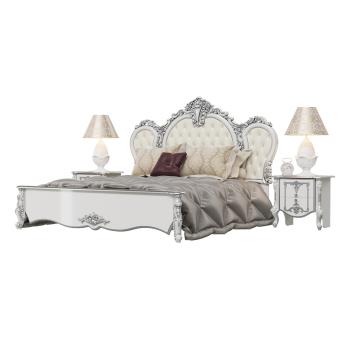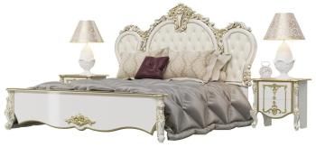 Роскошный набор состоит из очаровательной кровати и пары прелестных тумбочек. Резное кружево мягкого изголовья с ручной позолотой, эксклюзивные ножки и зеркальная гладь спинки – секрет красоты кровати Дольче Вита. Изголовье кровати задрапировано нежной искусственной кожей методом каретной стяжки, украшенной пуговками, наполнитель – прочный пенополиуретан.