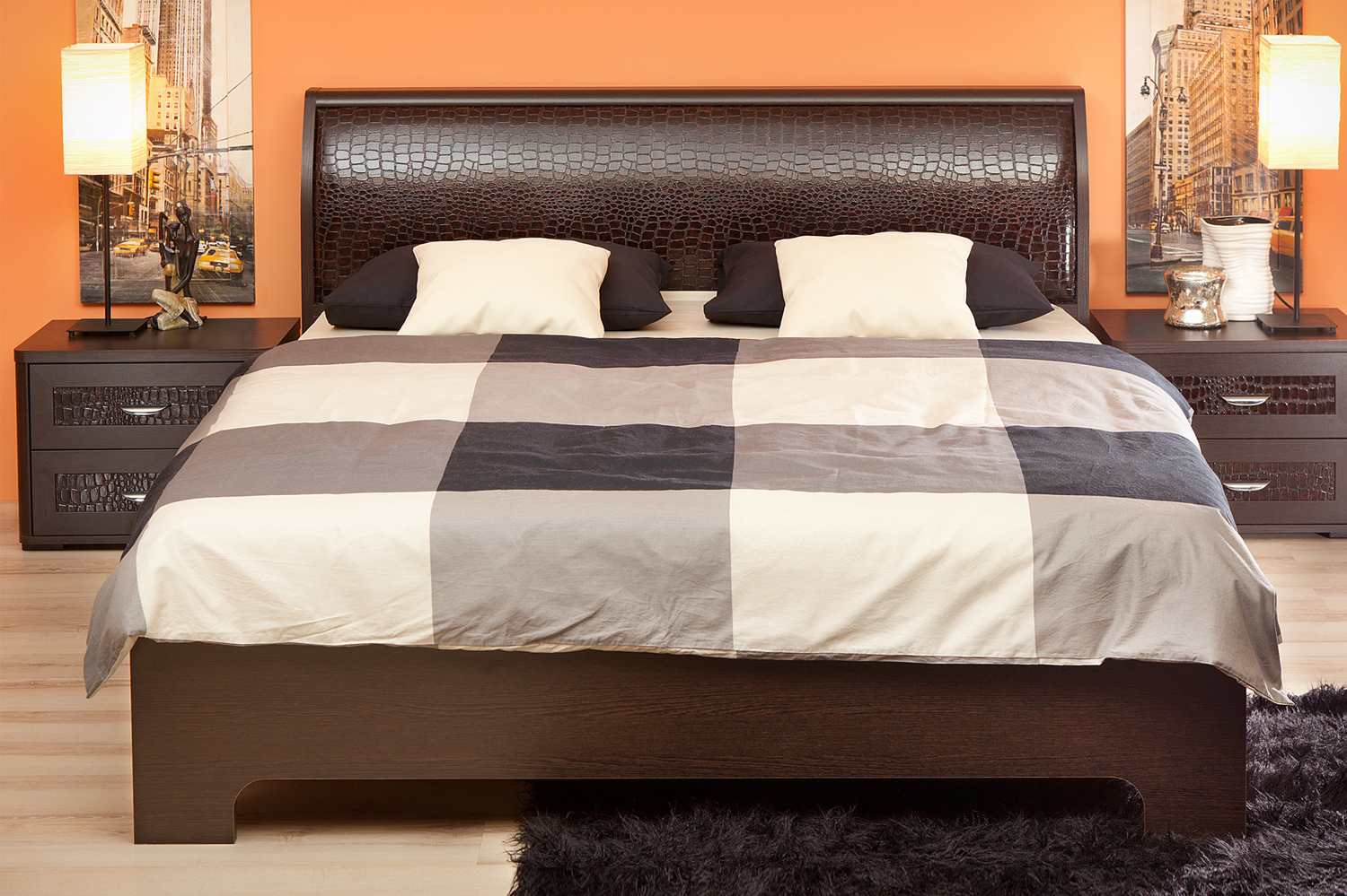 В модульной линейке Парма вашему выбору предлагаются кровати различных габаритов и внешнего оформления. Модель с изогнутой мягкой спинкой является одной из самых популярных, ведь такая форма изголовья смотрится очень эффектно. Украшением изделия служит экокожа «caiman темный» – мягкий и простой в уходе материал производится из вспененного пенополиуретана на хлопковой основе.
