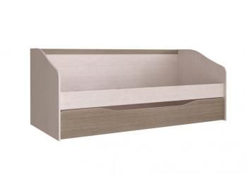 Кровать с ящиком выполнена в теплых тонах с использованием ламинированной плиты декоров «Дуб Атланта» и «Ясень шимо».