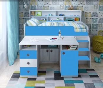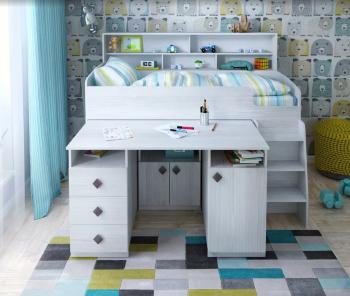 Под верхним ярусом у кровати-чердака «Малыш-5» от производителя ЯРОФФ предусмотрена тумба и небольшой шкаф, в которые поместятся не только игрушки, но также одежда. Комплекс дополнит стол с выдвижными ящиками и встроенной тумбой, выполненные в той же стилистике и цвете. Кровать-чердак «Малыш-5» станет настоящим украшением детской комнаты как для мальчика, так и для девочки.