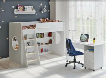 Под спальным местом расположена небольшая игровая зона. В игровой зоне размещен открытый стеллаж, который подойдет для хранения книг и игрушек.