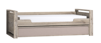 Детская или подростковая кровать-тахта с большим ящиком глубиной 182 мм на выкатных роликах. Его можно использовать как место для хранения постельного белья или как дополнительное спальное место для незапланированных гостей. Для полноценного спального места достаточно убрать разделитель и положить матрас. Размер матраса для основного спального места 190х90 см. Размер матраса для дополнительного спального места: 190х80 см, высотой до 18 см.