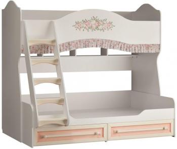 2-ярусная кровать из серии «Алиса» – компактный и изысканный уголок Франции в Вашем доме! Кровать выполнена в нежных цветах: белый, крем и розовый. Фасадные элементы выполнены из крашеного МДФ и украшены классической фрезеровкой с патиной и рисунком из роз. 2-ярусная «Алиса» предусматривает два спальных места: нижнее, для матраса размером 1200х1900 мм, и верхнее – 800х1900 мм. Комплектуется удобной безопасной лестницей, на ступенях антискользящее покрытие. В «Алисе» достаточно мест для хранения игрушек: удобные полки декорированы легкой съемной шторкой, и вместительные выдвижные ящики.