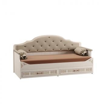 - Особенности: мягкая спинка, жесткий настил, 2 выдвижных ящика для белья