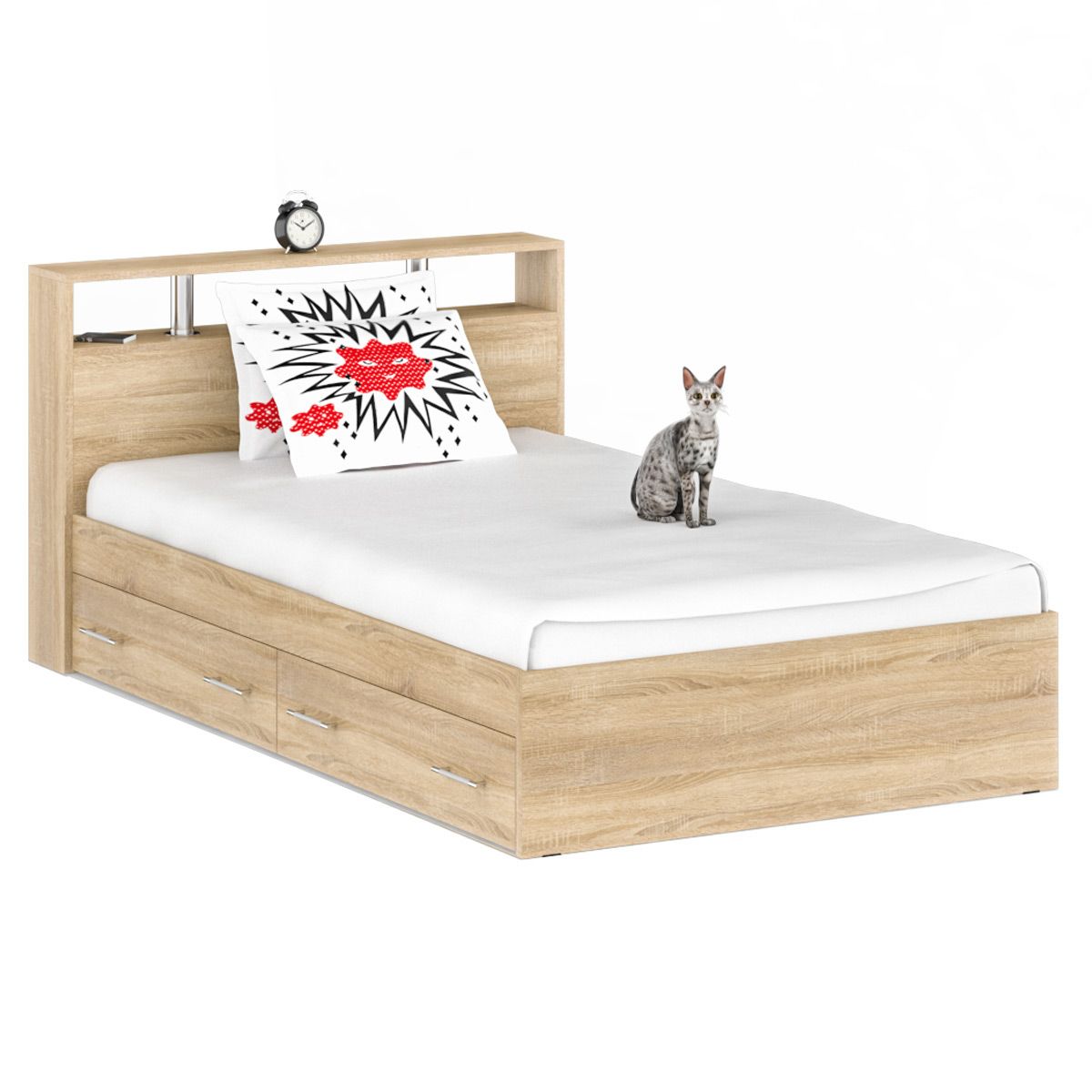 Кровать с ящиками 1400 Камелия + две тумбы. Габариты (ШхГхВ) 256х217х78,2 см, сп.м. 1400х2000 мм. В основании кровати расположены два вместительных ящика для хранения постельных принадлежностей и личных вещей. Набор мебели включает две прикроватные тумбы – в правом исполнении (выдвижные ящики расположены слева) и левом (ящики – справа).