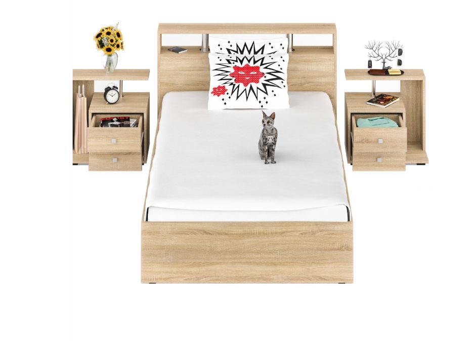 Кровать 1200 Камелия + две тумбы. Габариты (ШхГхВ) 236х217х78,2 см, сп.м. 1200х2000 мм. Удобная кровать с оригинальным изголовьем, декорированным хромированными стойками, станет основой респектабельного интерьера. Набор мебели включает две прикроватные тумбы – в правом исполнении (выдвижные ящики расположены слева) и левом (ящики – справа).